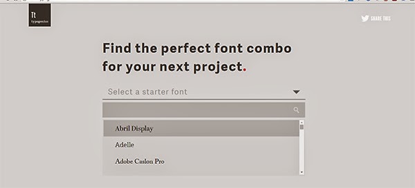 موقع جميل جدا ومفيدة خاصة للمصممين ، حيث يمكنك اختيار الخط الذي تريد استخدامه في تصميمك والموقع سيعمل على اقتراح خطوط اضافية تتماشى مع الخط الذي قمت باختياره .باختصار يجعل تصميمك أكثر اتساقا من ناحية الخطوط المستعملة فيه
