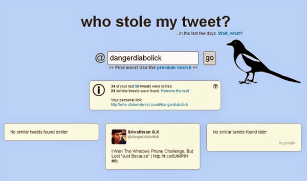 موقع رائع إذا كنت تود معرفة من يقوم بسرقة تغريدتك في الشبكة الاجتماعية “تويتر” .بعد الدخول الى الموقع تقوم بالنقر على الزر go والموافقة على تطبيق الموقع على التويتر ، بعد ذلك سيقوم الموقع بفرز تغريدتك والتغريدات المسروقة أو المشابهة لها.