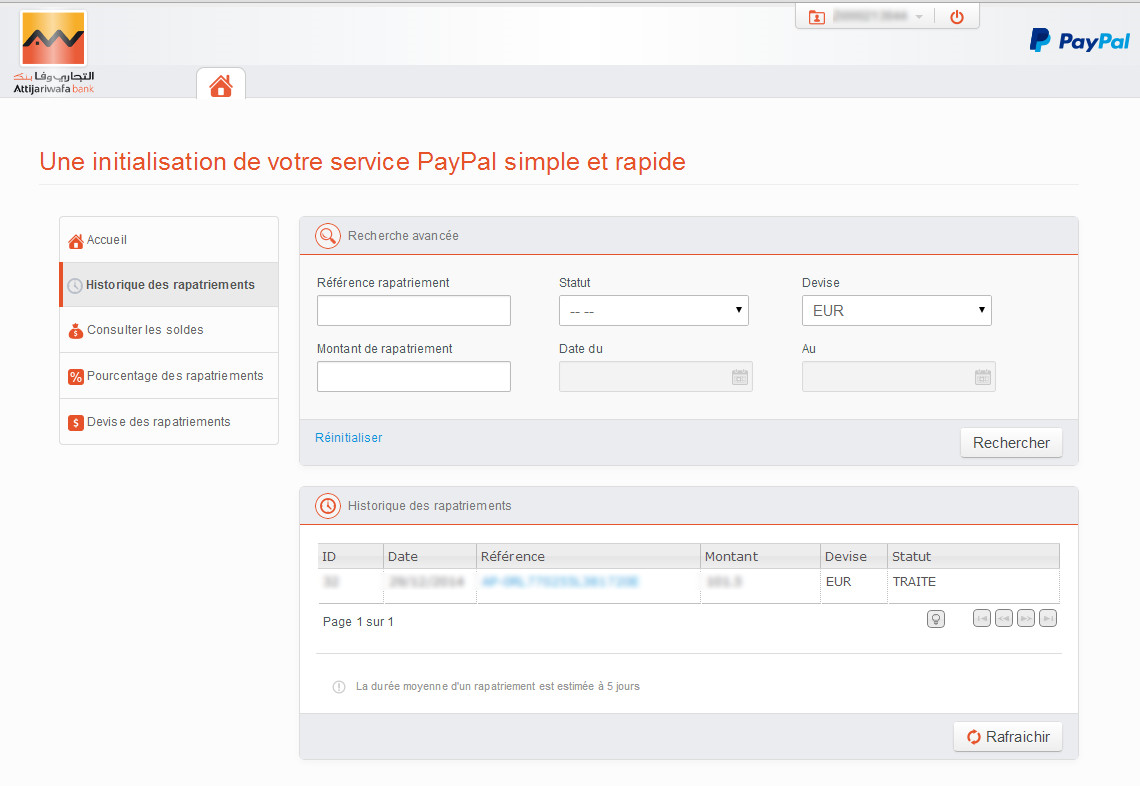 عملية التحويل من حساب بايبال إلى التجاري وافابنك تأخد 10 أيام ، كما ان المبلغ محدود سنويا في عشرة آالاف درهم ، سواء من حساب بايبال إلى التجاري وافابنك او العكس ! هكذا فإذا إستوفيت السقف المحدد ، فإن الحساب يتجمد إلى حين مرور سنة .