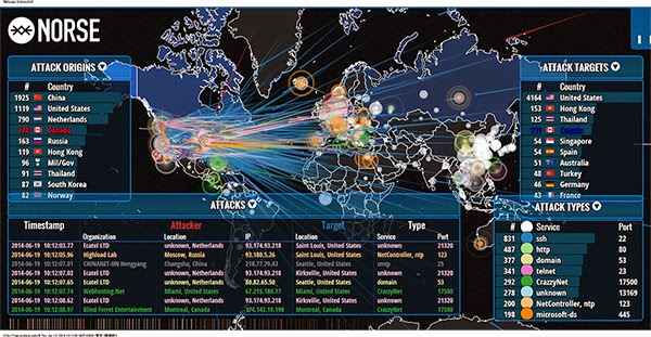 هو عبارة عن خريطة تفاعلية من شركة الحماية Norse التي يمكنك من خلالها مشاهدة الهجمات والمعارك الإلكترونية بين الهاكرز في مختلف بقاع العالم مباشرة .يمكنك طبعا متابعة الهجمات ومعرفة مصدرها ونوعها والدول المستهدفة بها.
