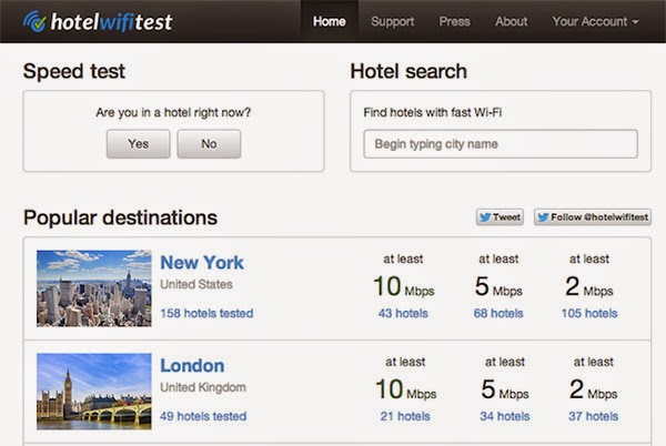 الديكور الداخلي، والموقع والسعر وتصنيف النجوم ..ليست فقط ما يهم المهووس عندما يقوم بحجم غرفة في احد الفنادق ، بل ما يهمه أكثر هو جودة الانترنت المقدمة فيه ، إذا كذلك من هذا النوع من المسافرين فيسعدني ان اقترح عليك هذا الموقع الذي يقدم لك أفضل الفنادق من ناحية قوة الإشارة اللاسلكية وسرعة الانترنت فيها .