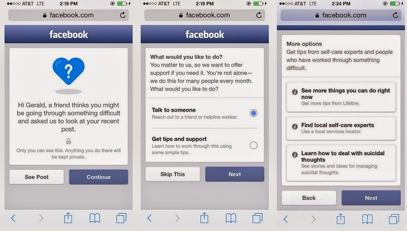 و يبدو أن فايسبوك أصبحت تعي أنها لم تعد مجرد فضاء للتواصل الافتراضي بين الأشخاص، و إنما أصبحت مكانا ينقل إليه المستخدمون مشاكلهم و معاناتهم و أحاسيسهم ولذلك قررت الشركة المساهمة الفعالة في محاربة ظاهرة جديدة قد تبدأ كذلك من العالم الافتراضي و هي ظاهر الانتحار.